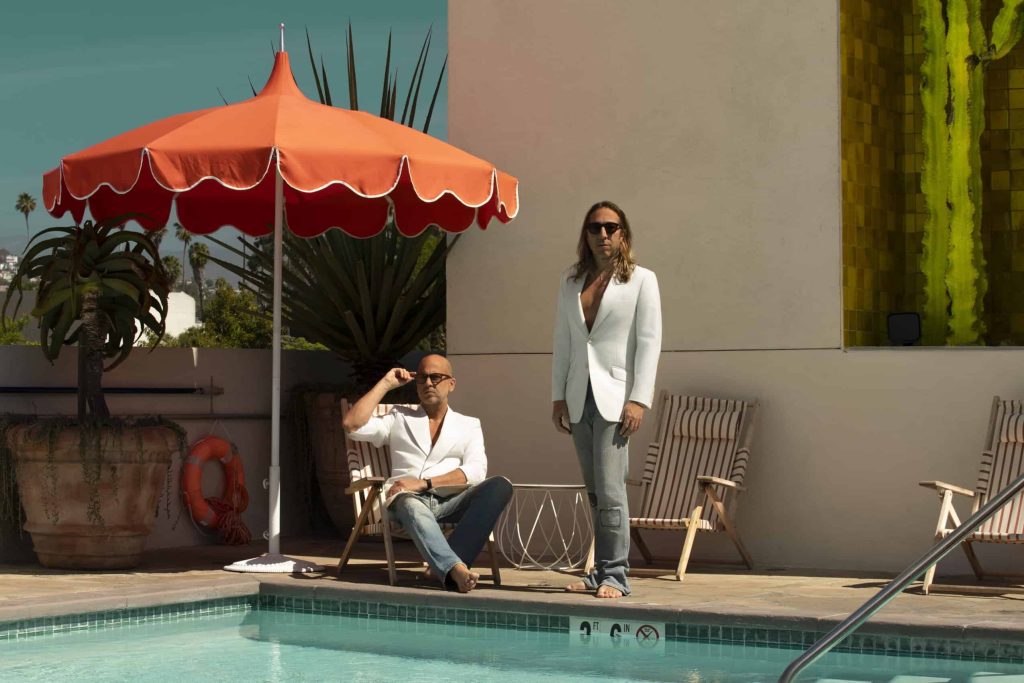The pool is where the mood crystallizes. A gold tile mosaic stretches across the main wall, catching and fracturing the sunlight so that the entire space flickers subtly, like a scene you’ve already decided you’ll remember. White loungers, striped umbrellas, that particular Silver Lake crowd that looks as though they arrived without trying—everything lands in that elusive space between relaxed and composed.